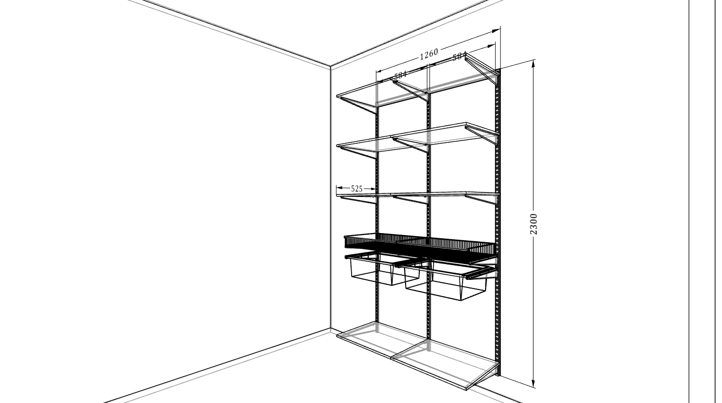 Размеры гардеробной: длина 1260мм, высота 2300 мм. Длина полок: 607мм. Глубина полок: серия 460.